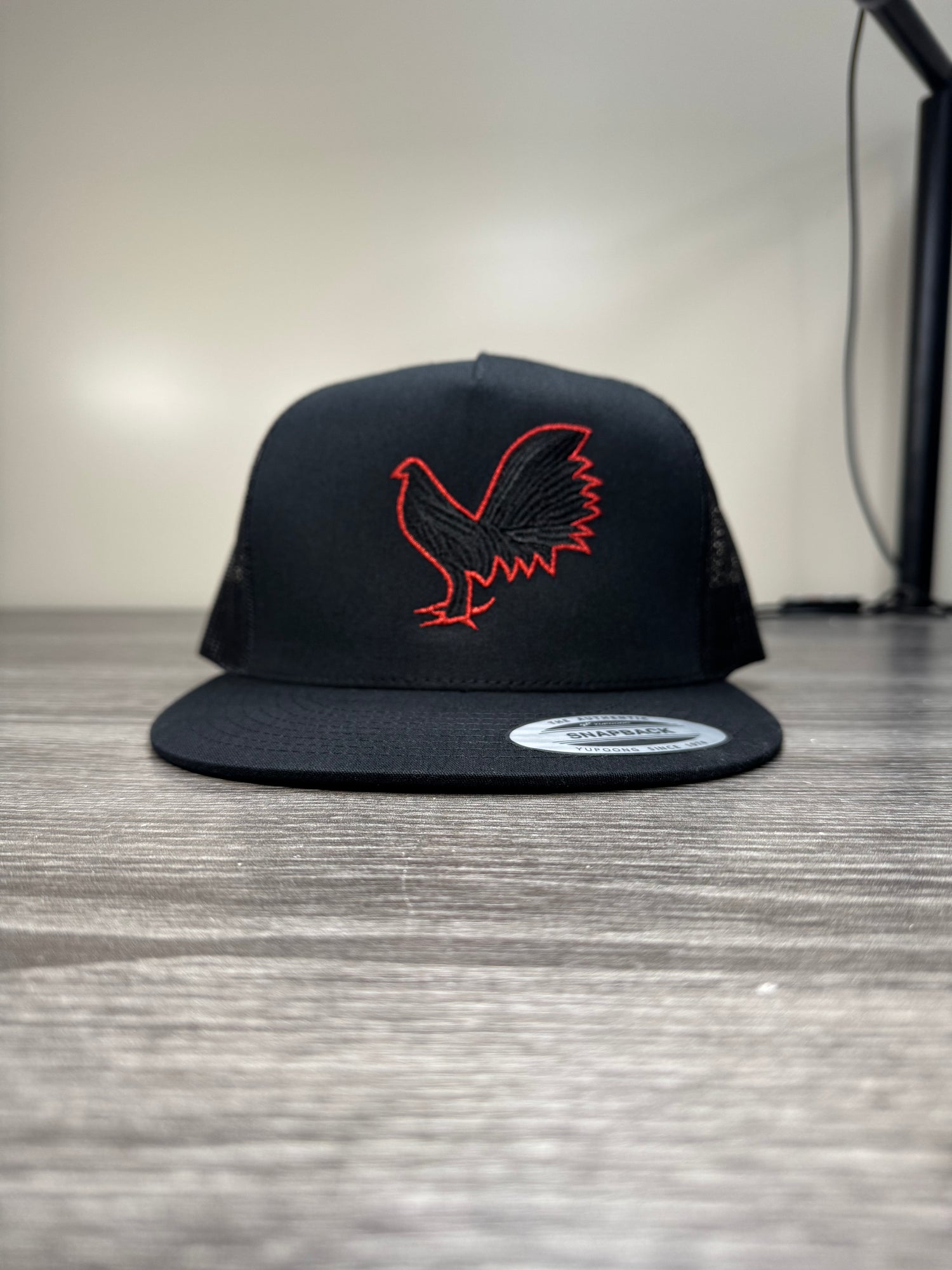 Yupoong adjustable snapback trucker hat. Red metallic thread outline of Gallo design.